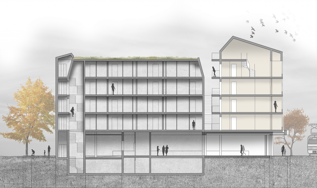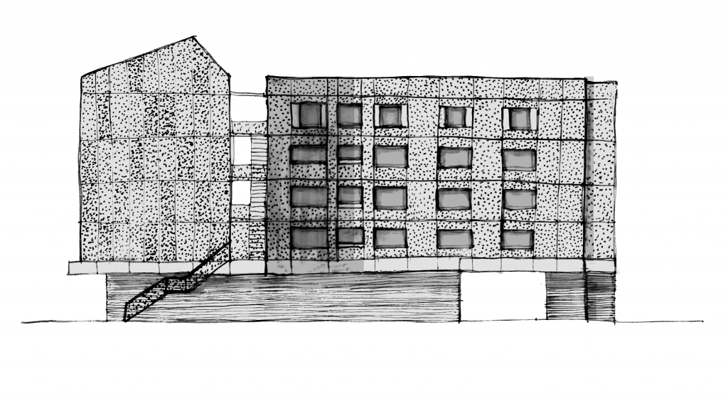 Der Entwurf folgt dabei einem „Regalkonzept“ mit übereinander angeordneten gleichen Wohnungstypen. Es entstehen 16 kleine 1-Raum-Apartments, die die Nachfrage nach suffizientem, bezahlbaren Wohnraum bedienen.