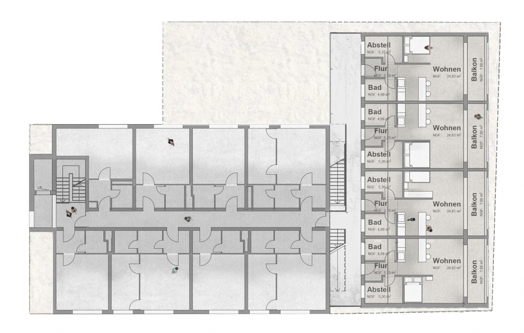 Anknüpfend an die Wohnungsstruktur im Bestand sollen kleine Wohnungen für 1-2 Personen entstehen.
